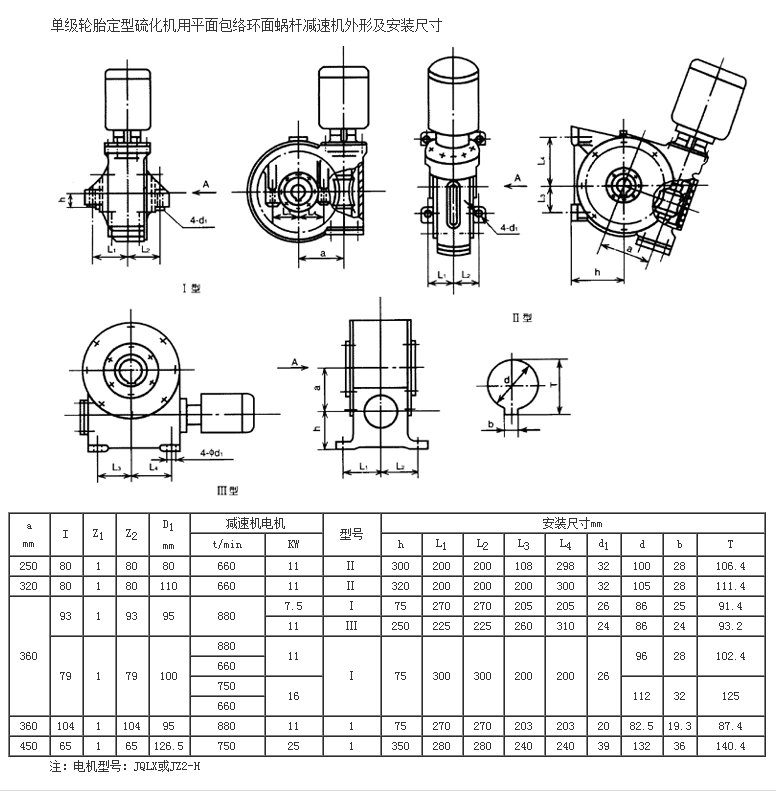 特征 環(huán)面蝸桿副具有承載能力大,傳動效率高,使用壽命長等特點,被廣泛應(yīng)用于輪胎定型硫化機(jī)中。 適用范圍 本系列減速器適用于36in、40.5in、42in、46in、55in、63.5in、85in、100in等各種規(guī)格的輪胎硫化機(jī)。 系列 單級減速器中心距:265mm,320mm,360mm,380mm,450mm。 雙級減速器中心距:140mm/280mm,160mm/320mm。