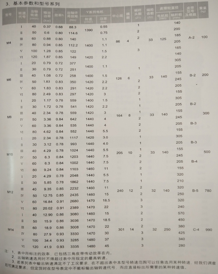 M型立式圓柱蝸桿減速機(jī)為二級(jí)減速傳動(dòng)機(jī)構(gòu),第一級(jí)為皮帶傳動(dòng),第二級(jí)齒形為阿基米德圓柱蝸桿蝸輪傳動(dòng)。其特點(diǎn)有:結(jié)構(gòu)緊湊傳動(dòng)比大、工作平穩(wěn)可靠、無(wú)噪音、蝸桿螺線導(dǎo)程角的情況下減速機(jī)具有自鎖性。
